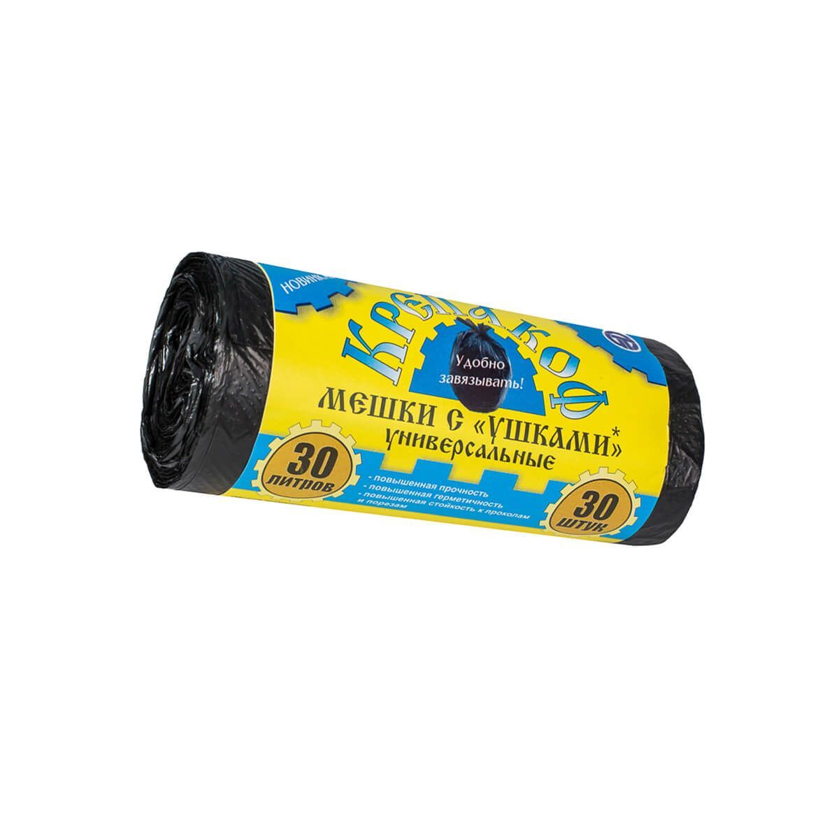 Мешки для мусора 30 л, с ушками, черные, в рулоне 30 шт., ПНД, 8 мкм, 580х460 мм, Крепакоф, 4607075710412